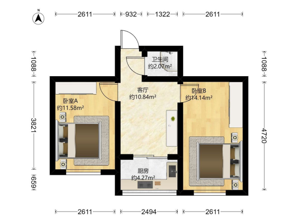 房屋戶型: 2 室1廳 1 廚1衛(wèi)